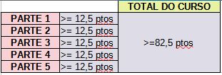 - Para superar o curso débese acadar a nota anterior en cada parte (12,5) e ademáis un mínimo de 82,25 no total do curso.