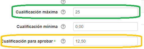 - Configuramos a nota máxima en 25 ( se non me equivoco) e a nota para mínima para aprobar en 12,5