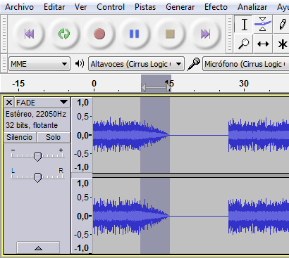 No espazo de tempo seleccionado vemos como a amplitude da onda vai diminuíndo paulatinamente (Fade Out). No lado oposto do espazo en silencio vemos como o son aparece bruscamente.