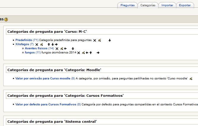 Esta páxina ten pestanas que permiten editar preguntas, editar categorías, importar preguntas e exportar preguntas.