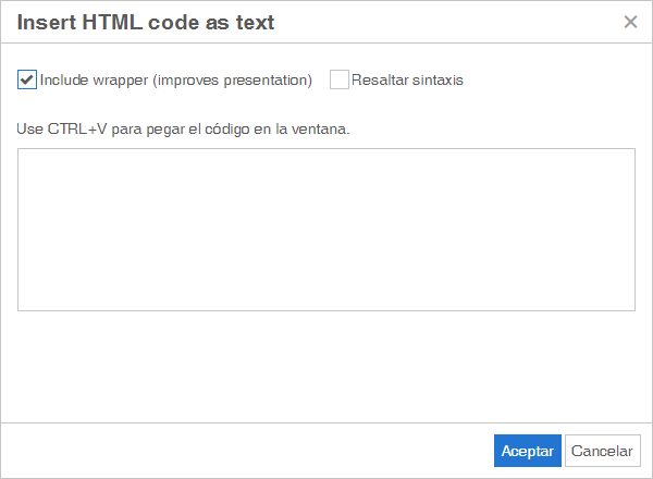 El botón "Html como texto" permite, además de insertar código para mostrarlo en el documento, resaltar con colores su sintaxis (acepta diferentes lenguajes), destacar líneas y seleccionar la apariencia