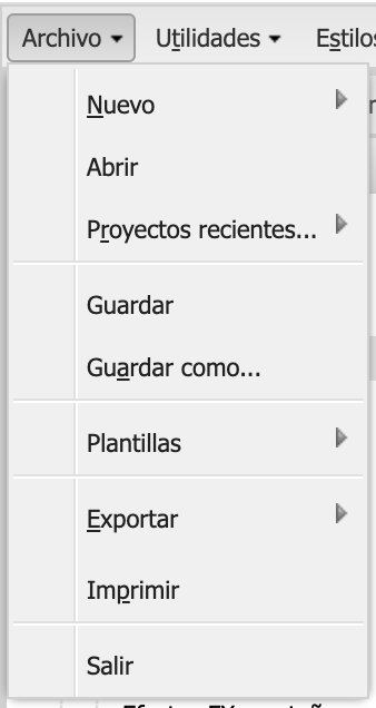 En el menú principal de eXe nos encontraremos una serie de opciones, necesarias para realizar tareas como abrir, guardar, imprimir, exportar, crear, importar, seleccionar estilos... y también las opciones "Modo avanzado" y "Visualización previa".
