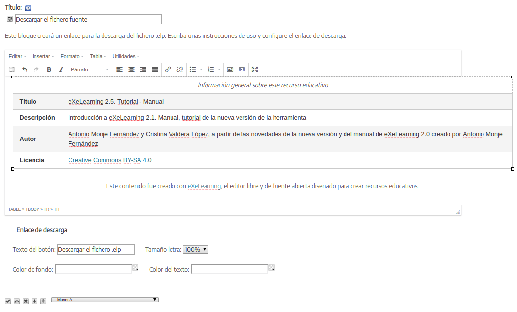 Este iDevice nos permite ofrecer el código fuente de nuestro recurso a través de un botón de descarga. Al pinchar en el iDevice "Descargar el fichero fuente", se crea una tabla con los datos introducidos en la página de "Propiedades".