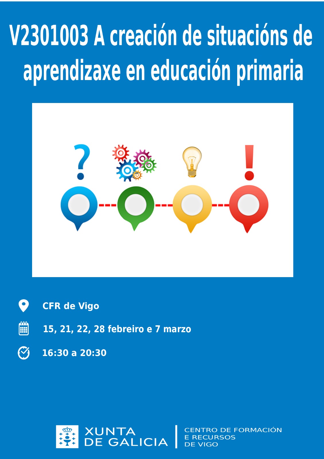 O curso V2301003 A creación de situacións de aprendizaxe en educación primaria desenvolverase ao longo de 4 semanas. o curso consta de 20 horas presencias. Para certificar é preciso a asistencia ao 85% das horas do curso. As faltas de asistencia, atendendo ás instrucións do Plan Anual  de Formación do Profesorado, non se poden xustificar.