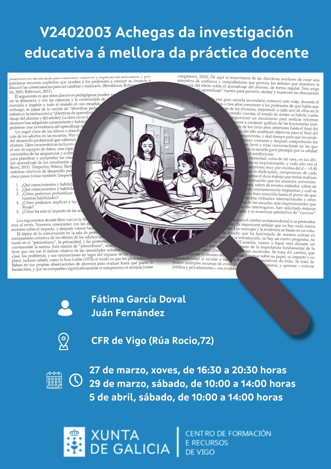O curso V2402003 Achegas da investigación educativa á mellora da práctica docente desenvolverase do 27 de marzo ao 5 de abril e consta de 12 horas presenciais.