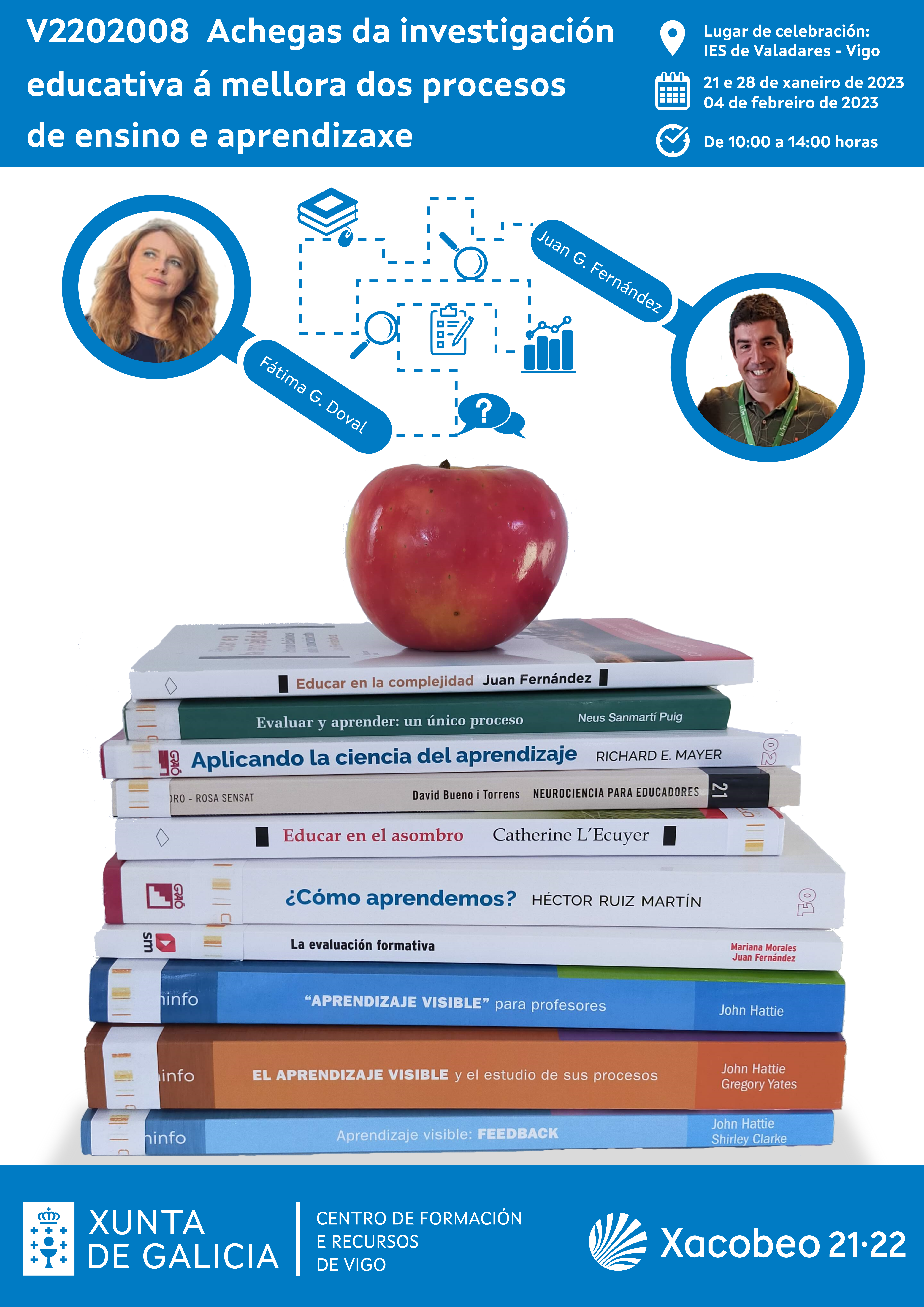 Estas xornadas sobre achegas da investigación educativa á mellora do proceso de E-A celebraranse no IES Valadares os sábados 21/01, 28/01 e 04/02 de 10:00 a 14:00.