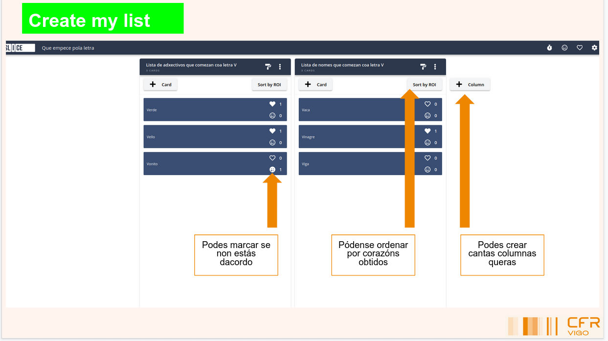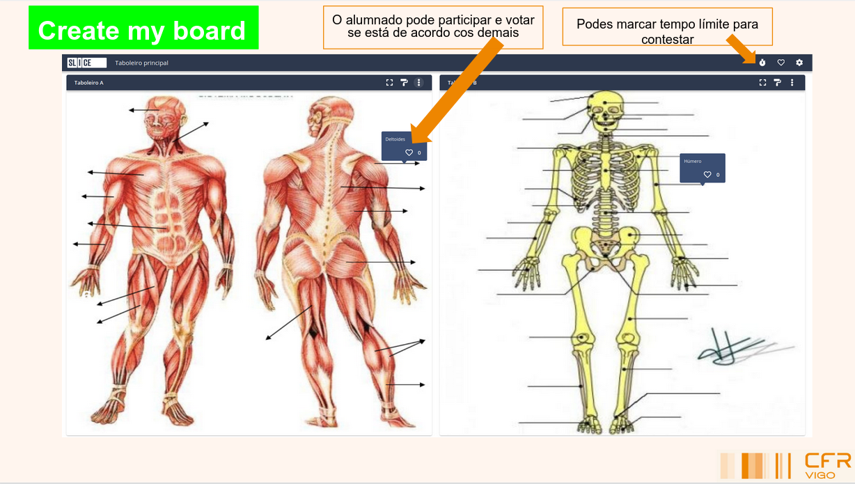 Crea taboeiros colaborativos (board) sen necesidade de rexistrarse, no que o alumnado pode escribir, e valorar as aportacións dos demais e listas (lists), que tamén poden ser valoradas e traballadas en común.