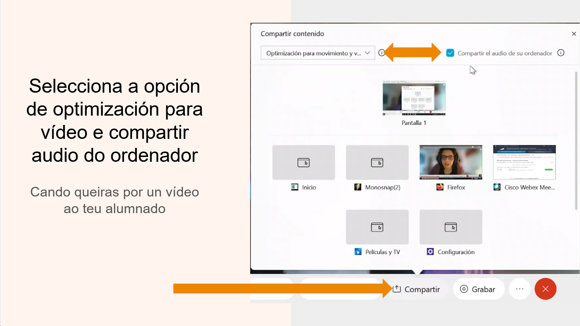 Cando quero compartir o son do meu ordenador coa audiencia