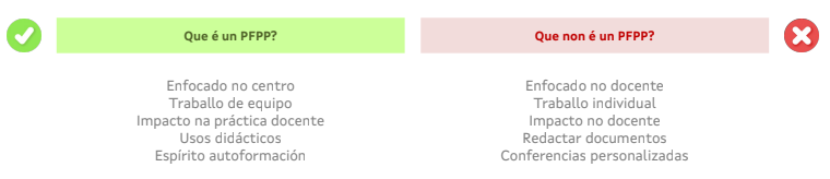 O centro educativo é o escenario idóneo para a formación do profesorado, xa que posibilita que se adapte ás necesidades propias do seu contexto. A finalidade é a actualización e o perfeccionamento das competencias profesionais docentes definidas no novo modelo de competencias, para a mellora da calidade da educación e dos resultados escolares do alumnado, en consonancia coas iniciativas impulsadas en relación co sistema educativo de Galicia. A formación debe ter unha repercusión directa na aula ou no centro. A formación de centro desenvólvese nos PFPP e nos GT/SEM externos.