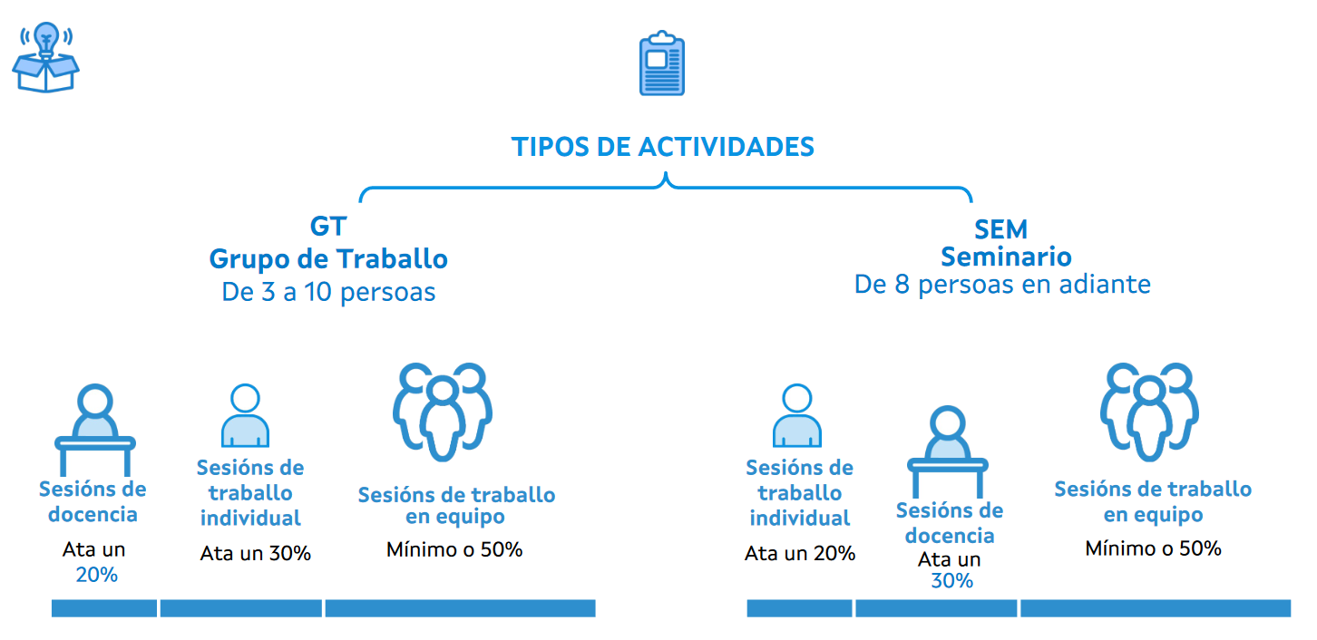 Existen varias liñas de traballo, definidas no Plan de Formación Anual do profesorado. Dentro de cada liña poden definirse un (ou varios) itinerarios de traballo. Por último, un itinerario pode implicar, á súa vez, unha (ou varias) actividades formativas relacionadas entre si, pero independentes. Existen dous tipos de actividades, os Grupos de Traballo (GT) e os Seminarios (SEM). Na seguinte imaxe pódense ver as diferencias máis significativas entre unha e outra: