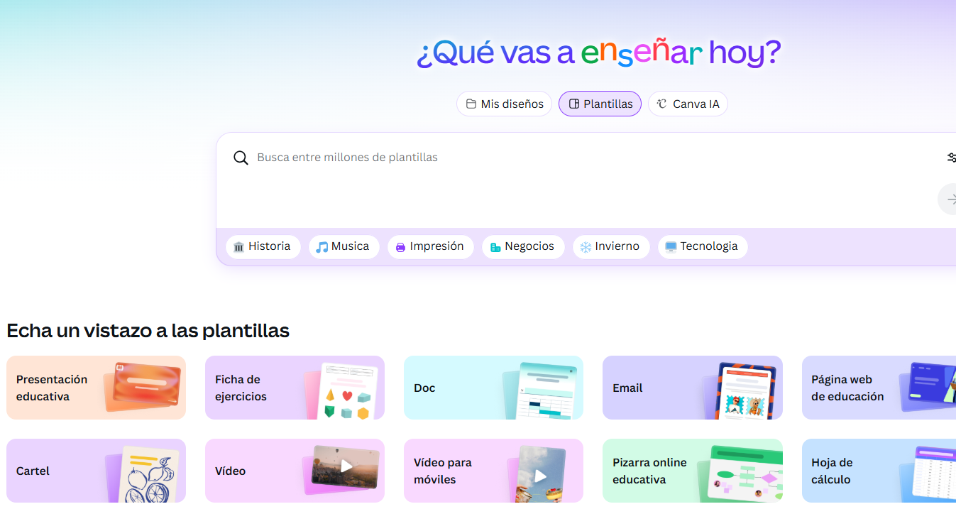 - Plantillas: podemos seleccionar un diseño xa predefinido e cambiarlle o que nos interese. Selecciona un e próbao adaptándolle a algún contido teu (unha ficha de exercicios por exemplo)