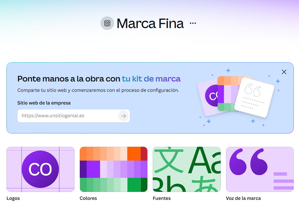 - Kit de marca: aquí se agrupan todos os elementos da nosa marca, é dicir, eu poderia ter as miñas fontes, cores, logotipos, imaxes.... aquí reunidas para que todos os meus diseños seguiran un mesmo patrón e ademáis os integrantes do meu equipo poderán acceder a estos recursos e aplicalos en calquera deseño, mantendo sempre a identidade visual da miña marca. Proba a crear unha marca para o teu traballo, engádelle algunha fonte, logotipo, cores...