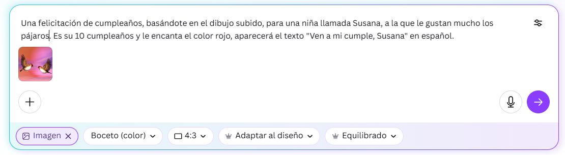1. Opción "Imagen", a partir de una imagen que tú le subas para que la tome como referencia, pedirle que te diseñe una imagen indicando un estilo, orientación, ...