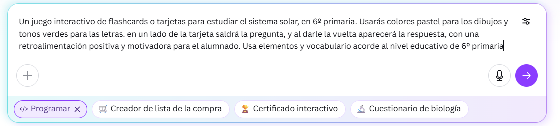 3. Opción "Programar", crear un juego interactivo de tarjetas sobre una temática concreta, o bien, el código HTML para el diseño de un horario escolar