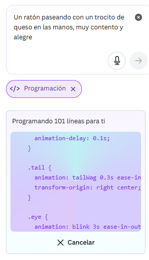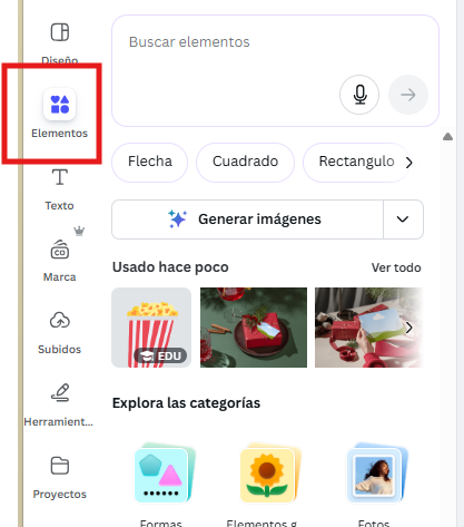 - Elementos: permite traballar con diferentes elementos gráficos de distintas formas: buscalos na galería de canva, pedirllos por voz, xerar imaxes ou explorar as categorías