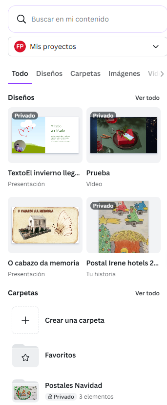 - Proyectos: representa o noso espazo persoal onde se garda todo o que imos facendo e subindo. Segue unha estrutura de cartafois para que todo estea organizado e poder acceder aos contidos máis facilmente