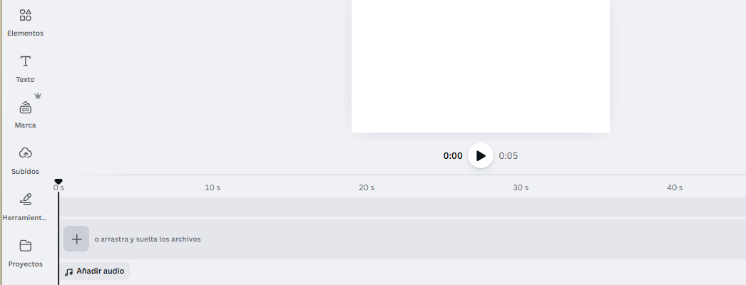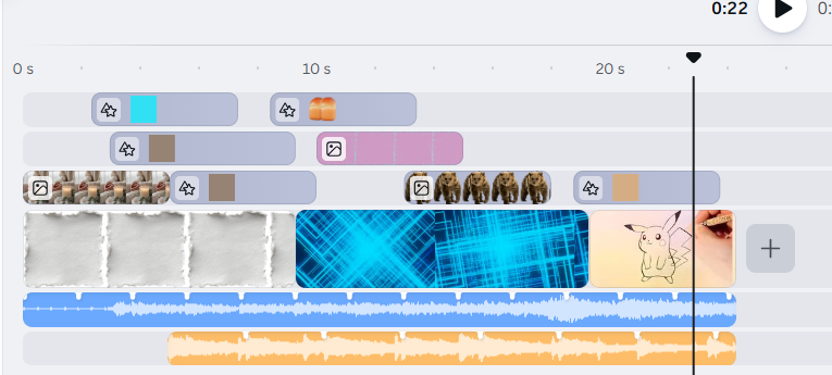- Na imaxe temos dúas pistas con 2 audios, una líña para establecer o fondo, e 3 líñas para colocar os diferentes elementos gráficos, nesta nova versión de Canva os elementos poden exceder a duración da páxina da presentación e poden superpoñerse