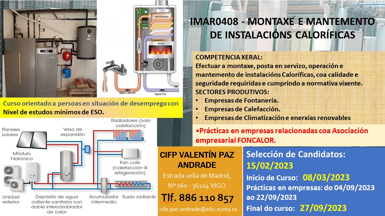 COMPETENCIA XERAL  Realizar as operacións de montaxe, mantemento e reparación de instalacións de produción de calor e a súa transmisión por fluídos, de acordo con os procesos e plans de montaxe e mantemento, coa calidade requirida, cumprindo coa normativa e regulamentación vixente, en condicións de seguridade persoal e ambiental. Inicio do curso (previsión) 08/03/2023