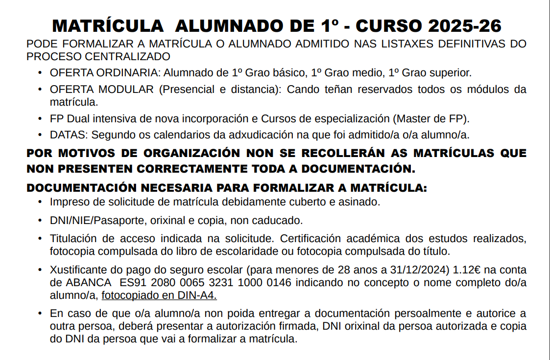 • Xustificante do pago do seguro escolar (para menores de 28 anos a 31/12/2025) 1.12€ na conta de ABANCA ES91 2080 0065 3231 1000 0146 indicando no concepto o nome completo do/a alumno/a, fotocopiado en DIN-A4.