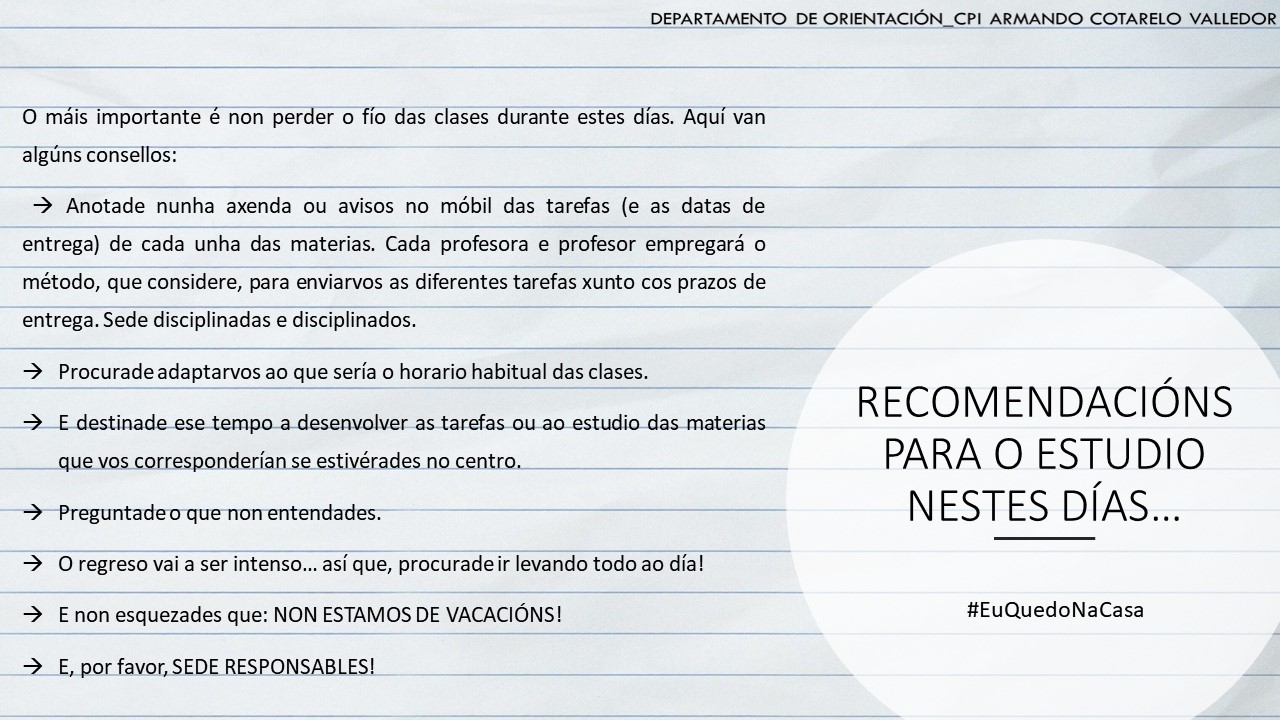 Algunhas recomendacións para o estudo, na casa, durante estes días! E recordade... #EuQuedoNaCasa!