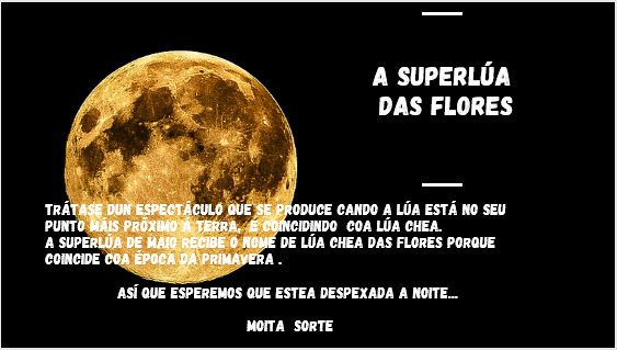 Xa sabedes que esta noite de madrugada ten lugar no noso inmenso ceo un increíble acontecemento no que a lúa é a gran protagonista. A superlúa lle chaman, dádesvos conta que leva nome de súperheroe? Pois como todo súperheroe ten os seus propios poderes, xa sabedes cales son, verdade? Iso é, ten o poder de brillar e de facerse grandeeeeeee no infinito universo….