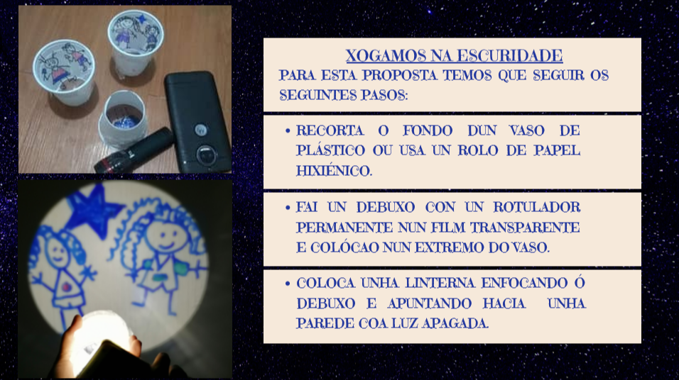 Na segunda proposta, invitámosvos a xogar na escuridade, podedes crear o voso pequeno e especial planetario.