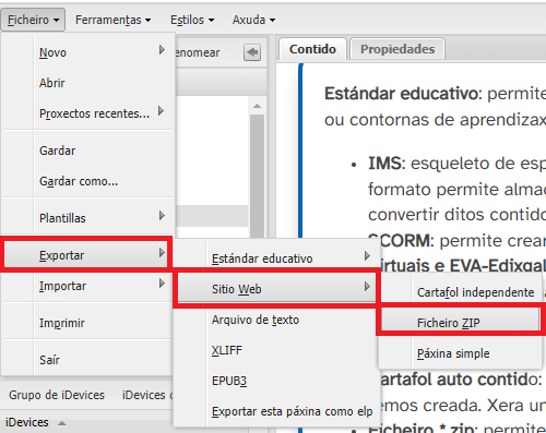 - Exporta o ficheiro en formato Educativo-SCORM 1.2 e extensión *.zip