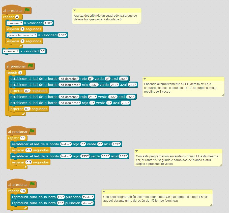 Co seguinte programa (mBlock para PC) ademais de avanzar en cadrado, encenderá os LEDs alternativamente en azul e branco, semellando as luces dun coche de policía. ou