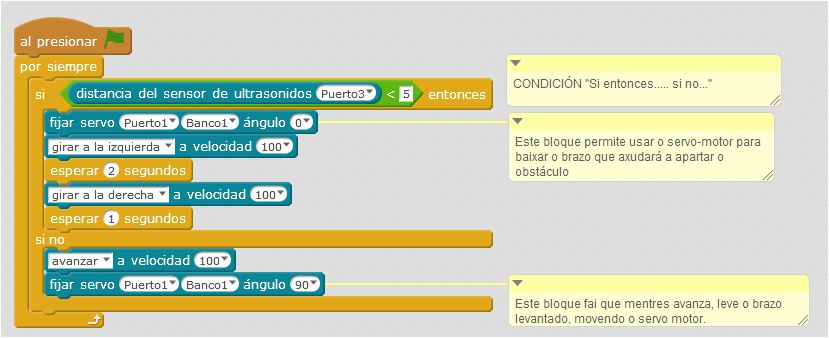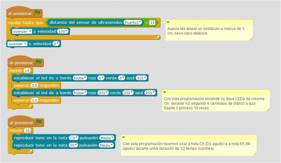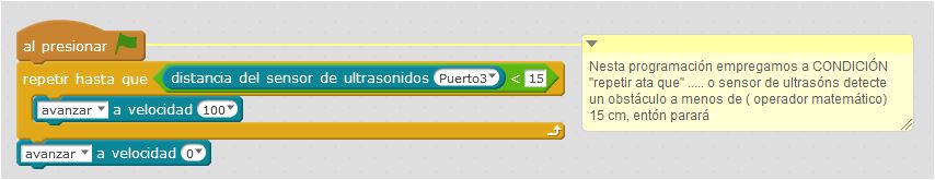 Empregaremos o bloque "CONDICIÓN" "repetir ata que..." E un bloque matemático "menor que..." Se queremos que o robot avance, ata que detecte un obstáculo a unha distancia menor que 15 cm. |