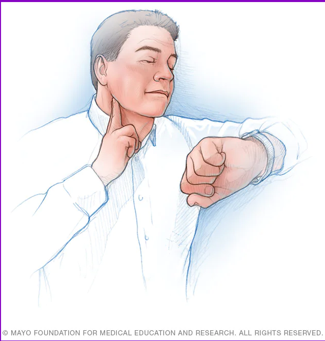 Pon a punta dos dedos índice e corazón no surco do pescozo o largo da tráquea para sentir o pulso na arteria carótida. Non presiones en ambos lados do pescozo o mesmo tempo, xa que pode que sintas aturdimento ou mareos.