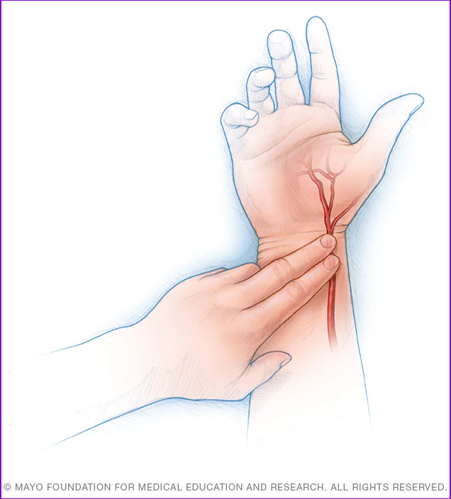 Coa palma da man hacia arriba, usa a punta do dedo índice e corazón da outra man para sentir a arteria radial entre o oso do pulso e o tendón onde está o dedo pulgar.