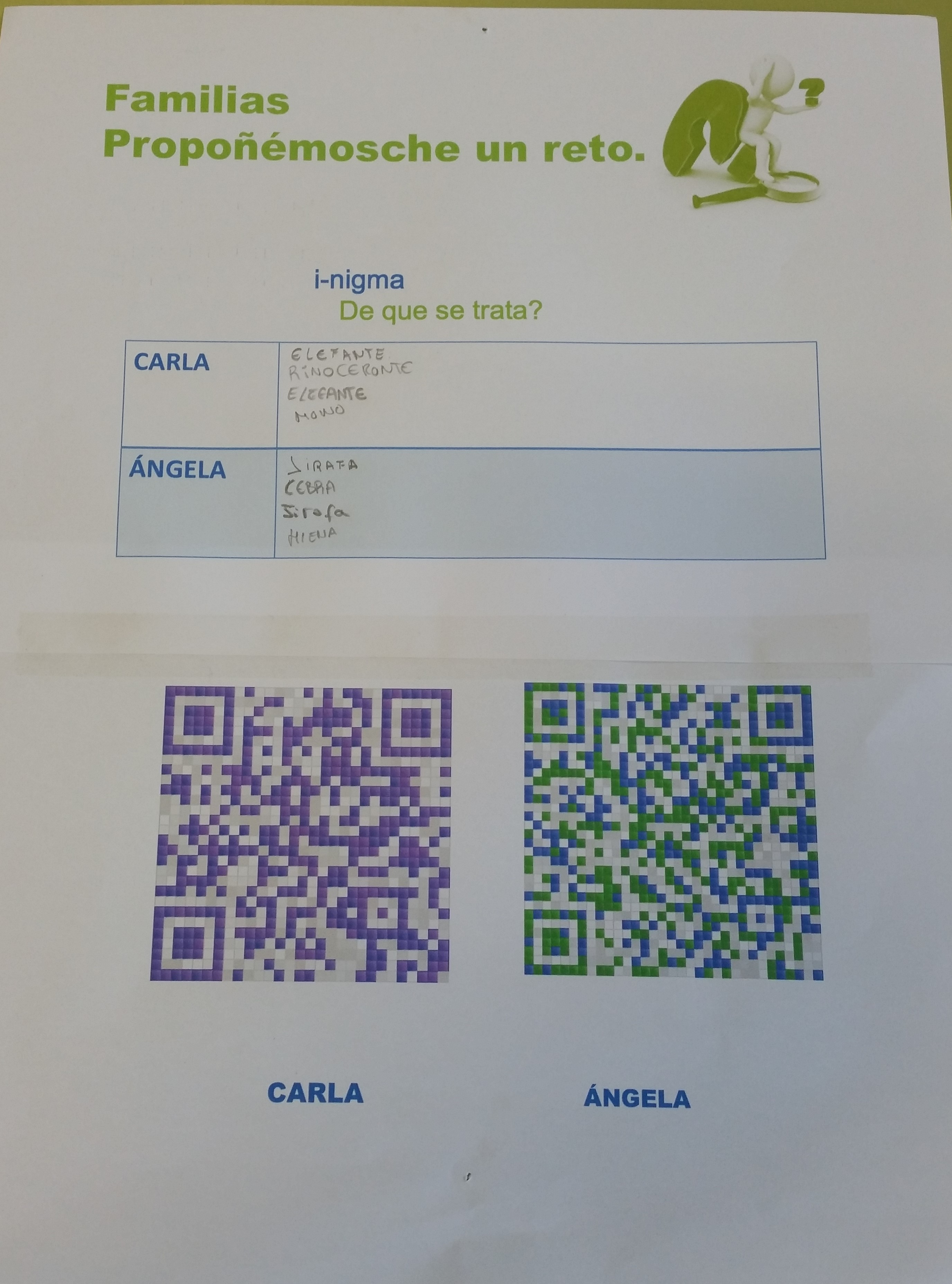 Esta actividade foi desenvolvida nunha escola infantil, e forma parte do proxecto "O Circo". O obxectivo desta actividade era inventarnos unha adiviña relacionada co tema. Unha vez que a temos transcrita na app Fancy Qr, escollemos o deseño e a cor. Esta actividade pasa polas casas do alumnado que van completando o cadro, ou tamén teñen a posibilidade de facelo na escola, tendo en conta o perfíl das familias para favorecer a relación familia-escola. Para a letura do QR recomendamos outra app "i-nigma", aínda que se pode ler con calquera outra.