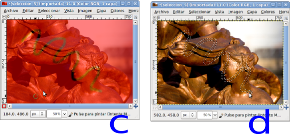Abre la imagen "seleccion_5.jpg" (a), presiona el botón Máscara rápida (b), elige la herramienta Pincel, selecciona una brocha bastante gruesa y pon como color de primer plano el blanco. Ahora haz un trazado sobre la imagen y observa que en la zona donde pintas va desapareciendo el color rojizo (c). Presiona el botón Máscara rápida y veráss cómo lo que hemos pintado se ha transformado en una selección (d).