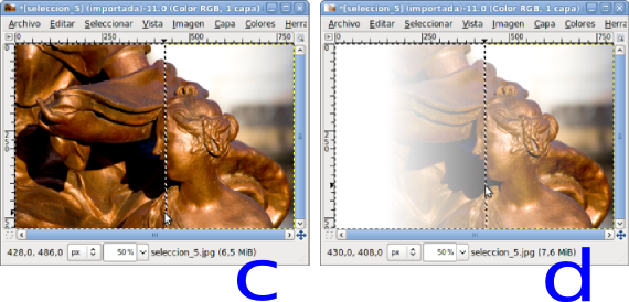 Observa que se ha "borrado" parte de la zona coloreada de rojo (b). Presiona el botón Máscara rápida y solamente se aprecia una línea central que forma la selección (c). Para comprobar qué zona es la seleccionada vamos a borrar la selección: Supr (limpiar), vemos cómo la imagen que teníamos se ha borrado de forma gradual desde la derecha hacia la izquierda (d).