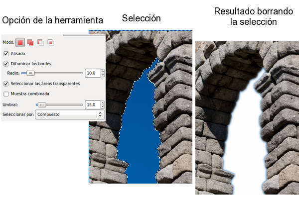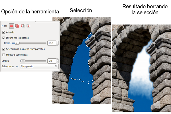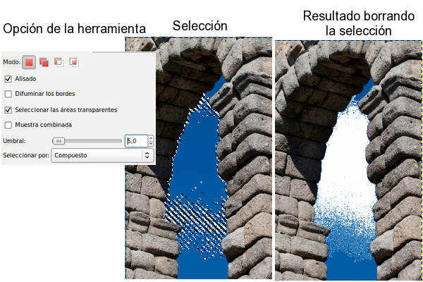Umbral, selecciona los colores similares al del píxel donde hemos hecho clic. Con valores pequeños la similitud tiene que ser muy grande, mientras que con valores grandes se seleccionan zonas con grandes variaciones de color con respecto al del píxel elegido.