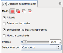 Seleccionar por, forma en que se puede evaluar la semejanza entre el píxel elegido y los circundantes. Compuesto es sobre el color globalmente o sobre cada uno de los componentes RGB.