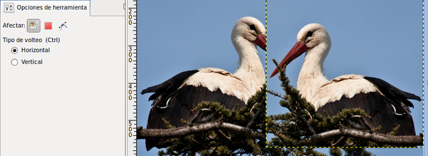 Invierte horizontal o verticalmente una capa, selección o ruta. Sólo debes seleccionar en las opciones de la herramienta si quieres que, la inversión, sea horizontal o vertical y hacer clic en la Ventana imagen para obtener el resultado.