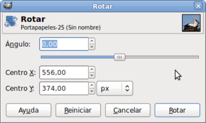 Una vez seleccionada esta herramienta haz clic en la Ventana imagen encima de la capa, selección o ruta que quieras rotar y mostrará la siguiente ventana: