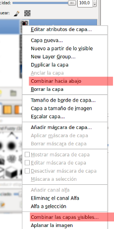 Existen dos formas de mezclar las capas de una imagen: Combinar capas visibles y Combinar hacia abajo, ambas se encuentran en las opciones que aparecen en la Ventana Capas cuando hacemos clic con el botón derecho sobre una capa activa.