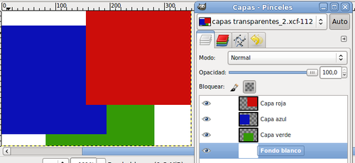 Por defecto viene seleccionada la opción Expendida lo necesario, que es la que recomendamos utilizar para que no se queden fuera de nuestra imagen partes de las capas utilizadas. Observa que se crea una sola capa denominada "Fondo blanco " y que une todo lo que teníamos en las capas visibles. La capa aumenta de tamaño para poder albergar el contenido de las capas "Capa azul" y "Capa roja". Se mantiene como capa independiente la capa que no era visible. Esta acción es reversible si pulsamos Ctrl+Z (o Editar --> Deshacer) y las capas vuelven a aparecer de forma independiente y en el mismo lugar en el que estaban. La operación Combinar capas visibles es conveniente realizarla cuando tenemos muchas capas y queremos unir algunas para trabajar de forma más cómoda. Guarda este trabajo como "capas mezcladas1.xcf".