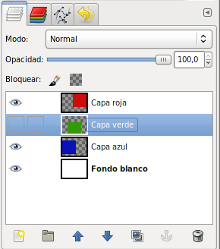 Selecciona la capa denominada "Capa roja", clic con el botón derecho del ratón sobre la capa activa y elige Combinar hacia abajo. Observa que se han unido las capas "Capa roja " y "Capa Azul ", tomando el nombre de esta última. La "Capa verde ", que se mantenía invisible, no se une con estas capas. Esta opción lo que hace es juntar la capa activa con la capa visible que se encuentre inmediatamente debajo de ella. Guarda el trabajo como "capas mezcladas2.xcf".
