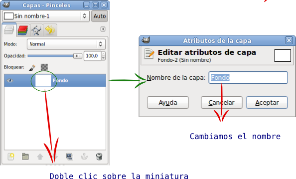 - En la Ventana Capas haz doble clic sobre la imagen en miniatura de la capa "Fondo", en la ventana que aparece cambia el nombre por el de "Fondo blanco" y presiona la tecla Enter.