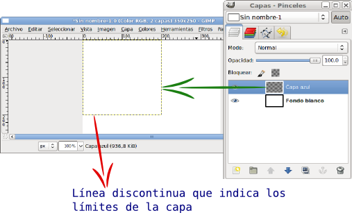 - Observa que en la Ventana Capas encuentras las dos capas creadas, "Fondo blanco" y "Capa azul". Si seleccionas esta última, en la Ventana imagen se muestra con una zona cuadrada delimitada por una línea discontinua, que marca el tamaño y posición de la capa.
