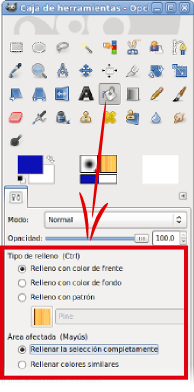 Habitualmente se conoce como bote de pintura porque permite rellenar con color sólido o con un patrón las zonas seleccionadas de una capa.Esta herramienta tiene tres opciones de relleno: