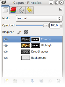 Observa la Ventana Capas - Pinceles. Puedes ver que el atajo que has utilizado para formar esta imagen ha creado varias capas. En la imagen se observa que la denominada “Chrome” está seleccionada (está en vídeo inverso con respecto al resto de capas). Puedes seleccionar cualquier capa simplemente haciendo clic sobre su nombre o sobre la imagen en miniatura que se muestra a la izquierda del nombre.