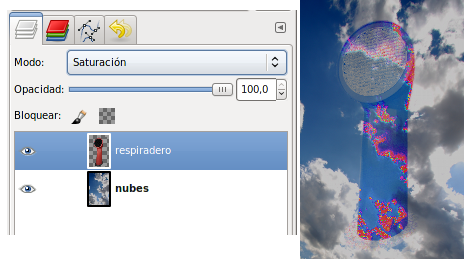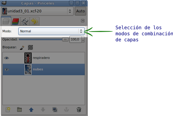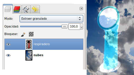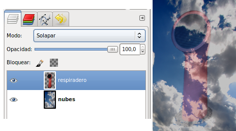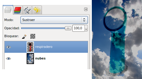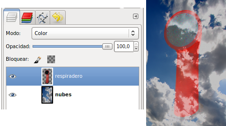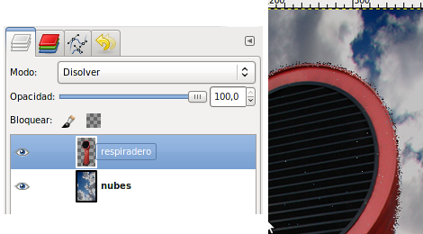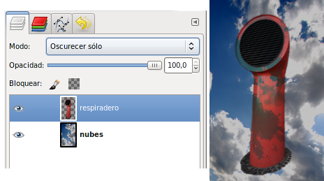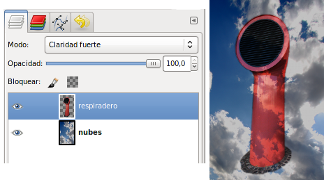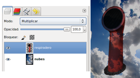 Los píxeles de la capa superior reemplazan a los píxeles de las capas inferiores. Es el Modo de Combinación de capas por defecto. La capa superior cubre las capas que están por debajo. Para ver algo por debajo de la capa superior, la capa debe tener áreas transparentes. Alrededor del respiradero hay zonas transparentes que dejan ver lo que contiene la capa inferior.