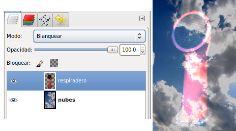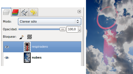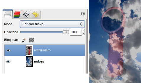 Vas a utilizar los distintos Modos de Combinación de capas para ir comprobando su funcionamiento. A continuación se muestran las posibilidades de cada modo cuando se aplican sobre las dos capas que tiene la imagen, llamadas "respiradero" y "nubes".