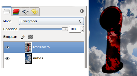 Ennegrecer: Tiende a oscurecer la imagen de modo similar al modo Multiplicar. Hace que aparezca detalle en las zonas claras.
