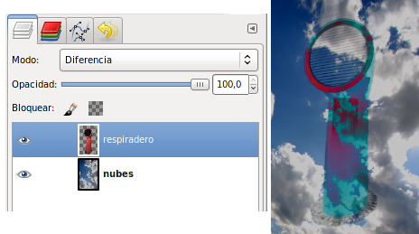 Diferencia: Es uno de los modos más espectaculares. Halla la diferencia entre los valores absolutos de los píxeles compuestos (todas las capas) y el píxel de la capa activa. Se observan las diferencias atendiendo a los píxeles que hay debajo de la capa activa.