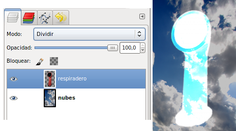 Dividir: La capa activa da luminosidad a toda la combinación de capas con colores complementarios.